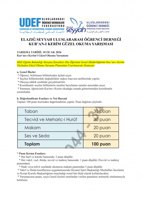 Fırat Üniversitesinde Öğrenim Gören Uluslararası Öğrenciler için 25 Ocak 2026 da Kuranı Kerim Yüzüne Güzel Okuma Yarışması yapılacaktır.
